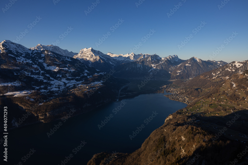 Great view on a beautiful morning over a lake called Walensee. The mountains in the background are illuminated by the morning sun.