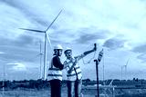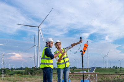 Engineers using meteorological and drone instrument collect data laptop to measure the wind speed, temperature,humidity and solar cell system on wind turbine station is sustainable energy concept.