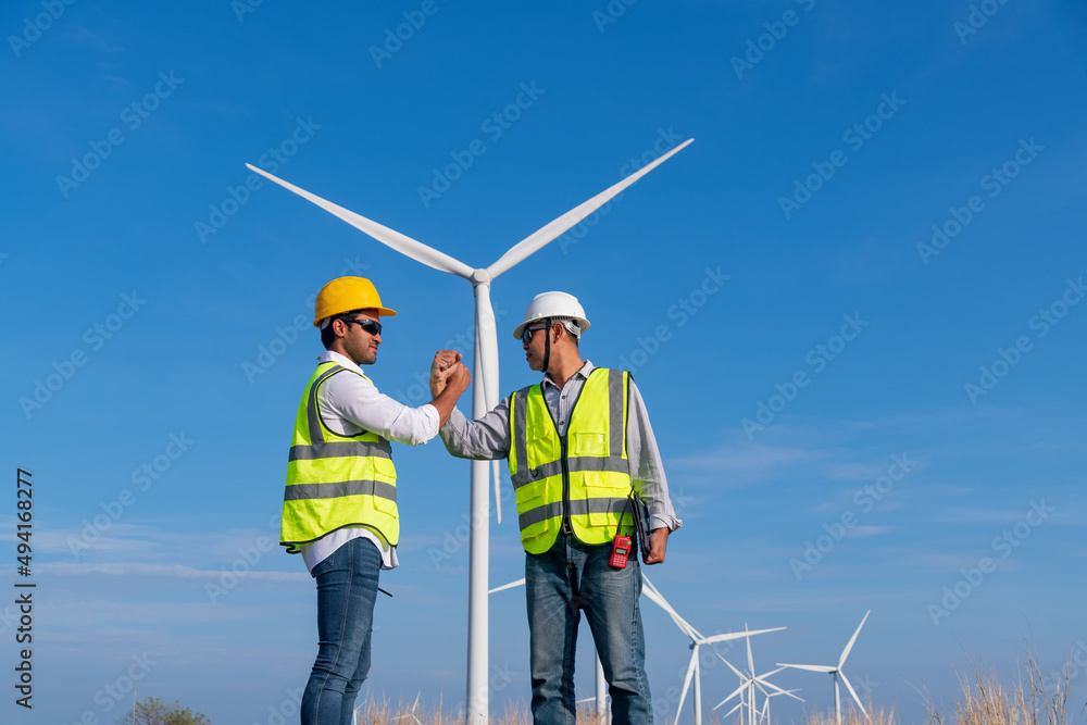 Engineer wearing uniform ,helmet hold document inspection work in wind turbine farms rotation to generate electricity energy. Green ecological power energy generation wind sustainable energy concept.