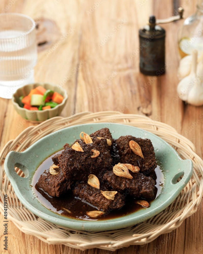 Daging Hitam Palembang or Black Meat Malbi, Jambi and Palembang Authentic Recipe Food. Beef Stew with Sweet Soy Sauce