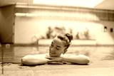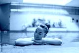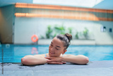 Young serene female dreamer chilling and relaxing alone in swimming pool water in fitness spa center. Mind health and getaway