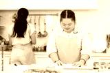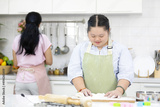 down syndrome teenage girl or housewife making thresh flour for make a bread in a kitchen