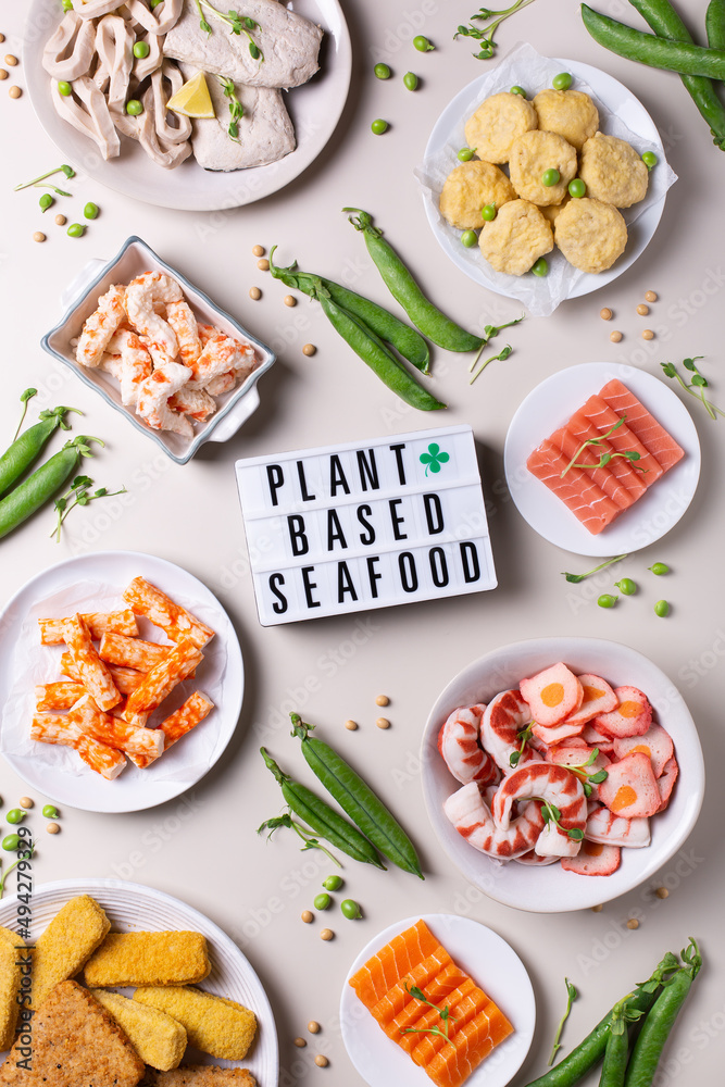 Vegan Plant based fish and seafood, food reducing carbon footprint