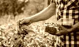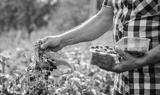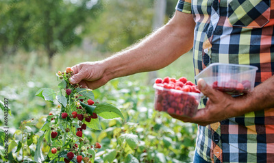 Gardening. Man picking raspberries, close up photo. Hobbies and leisure