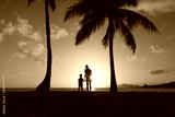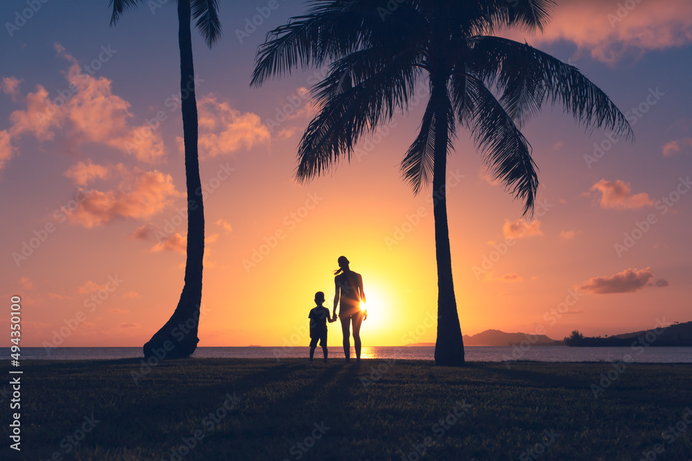 Mother little child holding hands walking in a grass field looking out to the ocean sunset.