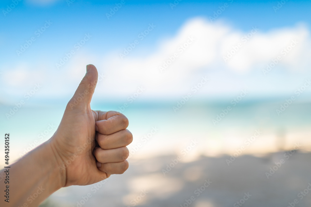 Supper Beach holiday vacation. Thumbs up against beach background.