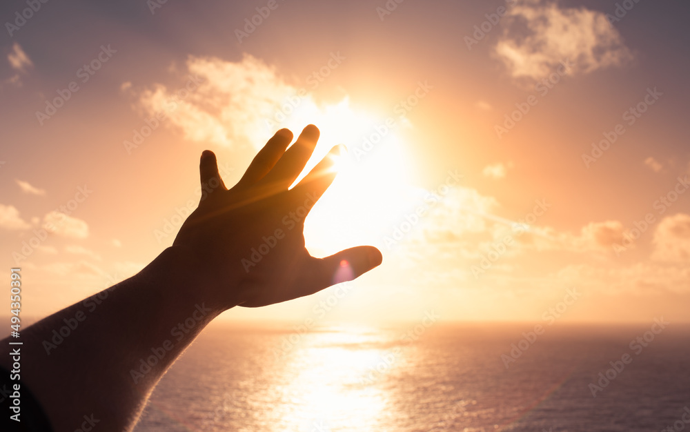 Hand up to the sun touching the warm light. Peace in nature