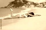 woman relaxing on the beach. photo of woman wear bikini sitting at sand beach and look landscape, asian beauty.