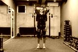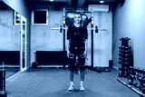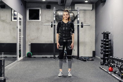 Sportswoman in a special EMS suit standing in the middle of the gym.