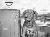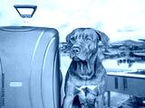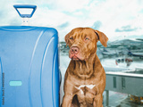 Lovable, pretty puppy of brown color and a blue suitcase. Travel preparation and planning. Close-up, indoors. Studio photo, isolated background. Concept of recreation, travel and tourism. Pets care