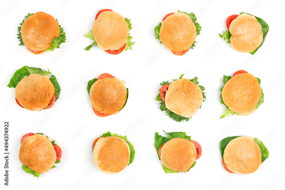 Pattern, bread, burger, hamburger, or barbecue. With vegetable and tomato salad on a white background
