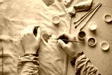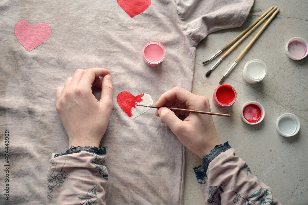 Drawing red and pink heart on clothes. Painting on a gray fabric cloth with a paintbrush. Creating your own t-shirt workshop