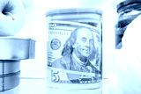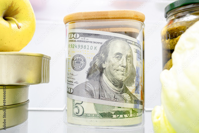 Money, cash banknotes, US dollars in a glass jar, canned food and other food in the refrigerator. Cash saving concept, shadow economy, tax evasion, bad economic decision