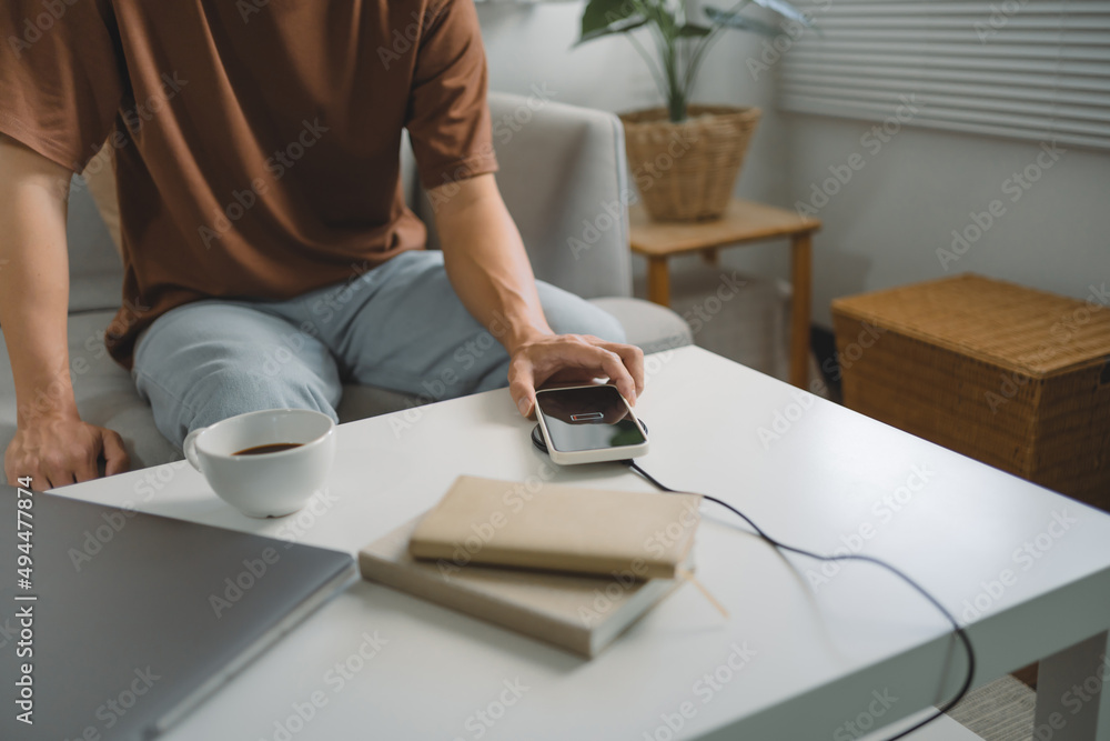 Man hands plugging a charger in a smart phone. Charging Smartphone with Wireless Charging Pad at Home