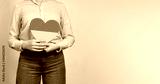 Woman holding symbol of heart in yellow and blue colors in her hands