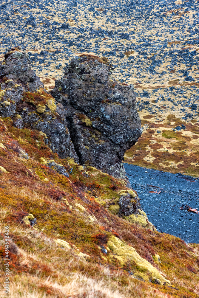 Close up shot of large lava rock in black sand beach in Iceland near Arnarstapi.