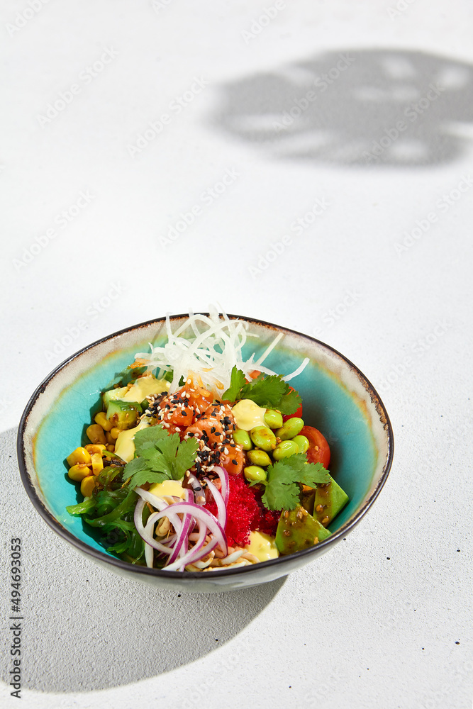 Hawaiian cuisine - Poke bowl with salmon, avocado, edamame and vegetables. Pokebowl in ceramic dish on white background with leaves. Summer menu in asian style. Healthy food.