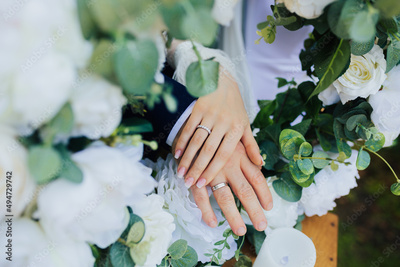 Hands of couple with wedding rings lying on a wedding arch decorated with white flowers and greenery.