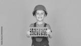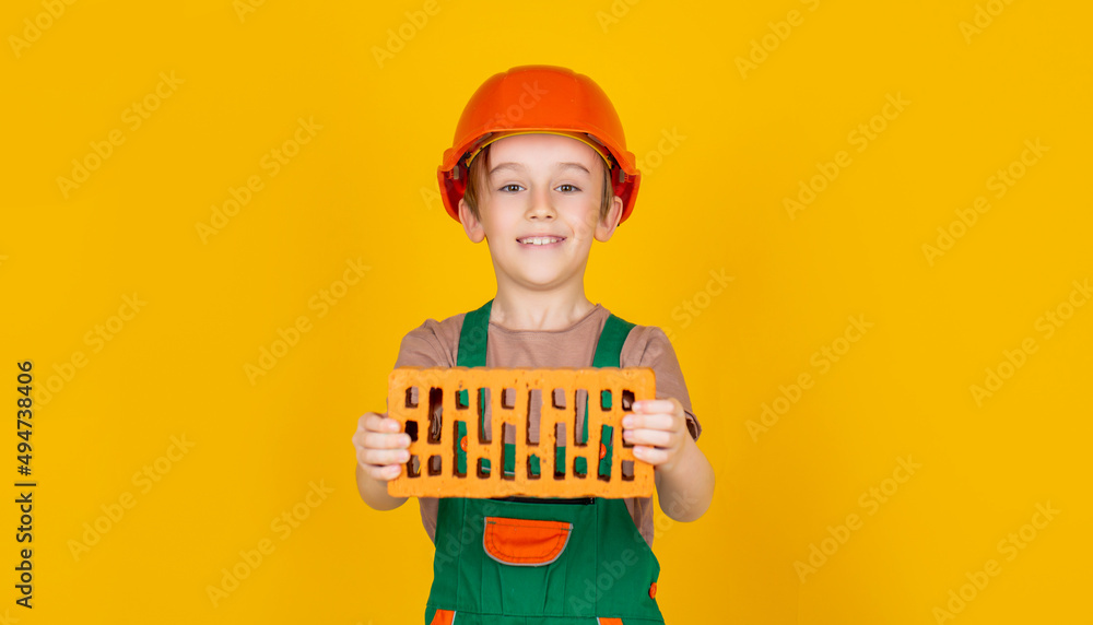 Boy in a construction helmet holds a brick in his hands on yellow background. Little builder in helmet. Child dressed as a workman builder. Little boy wearing helmet. Child building helmet