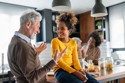 Portrait of happy multigeneration, multiethnic family having fun in kitchen at home