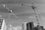Two tower cranes on construction site against background of unfinished multi-storey buildings and blue sky