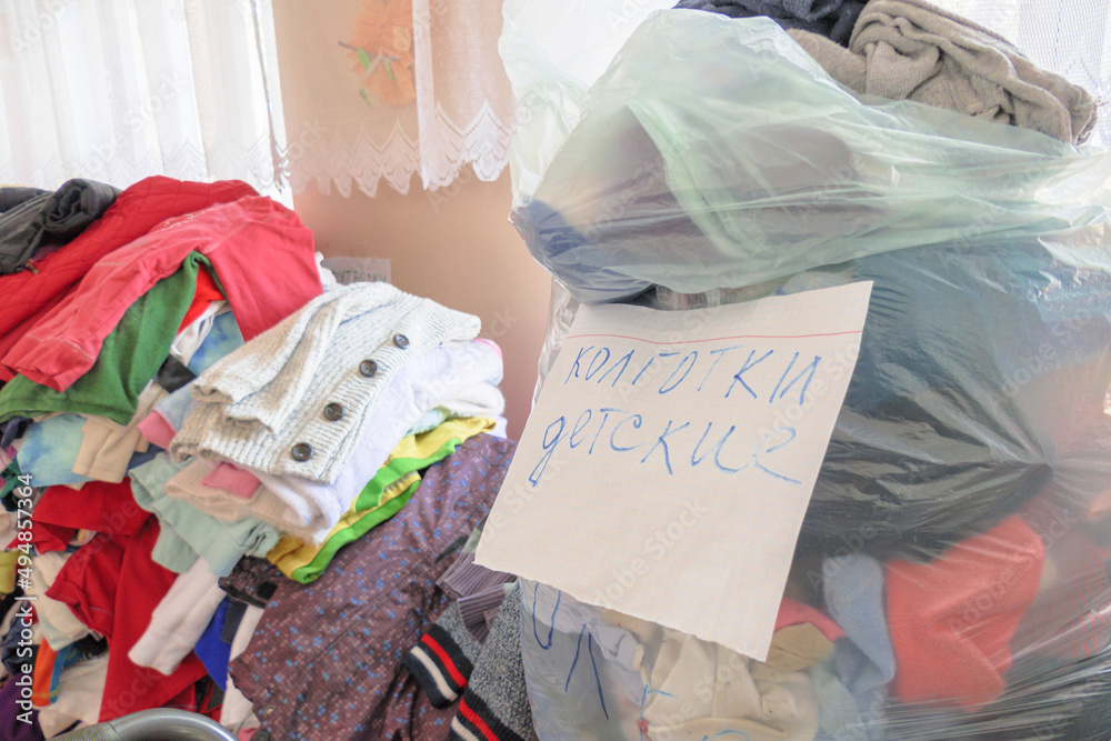 Things for children who fled from the war. The inscription on the sheet - children's tights
