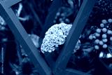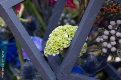 Green Cockscomb Celosia Cristata Annual flower in an exotic bouquet with wooden elements. Modern up-to-date floristry.