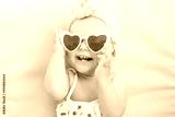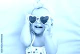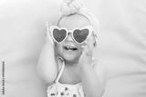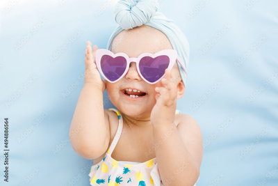 Funny cute baby girl on summer vacation. Child having fun in swimming pool. Sweet toddler girl in colorful swimsuit and sunglasses relaxing on sunbed. Free space for text.