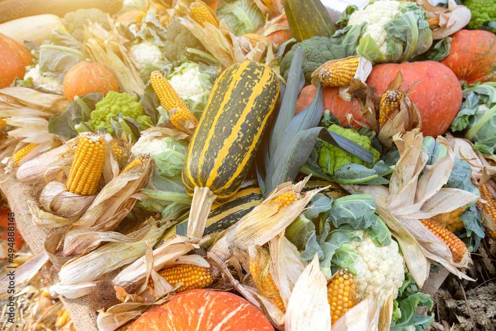 Cauliflower, corn, pumpkins, zucchini and other vegetables on the counter of the agricultural fair. The concept of farming, harvesting, Thanksgiving. Agricultural industry