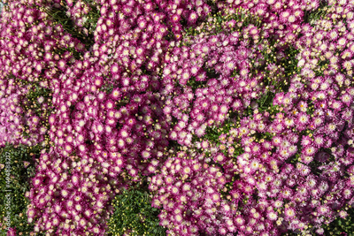 Many small chrysanthemums adorn exhibition stand in park. Natural floral background.