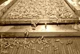 Process of making croutons. Cracker on conveyor. Bread products on conveyor line, in food factory or in factory with equipment