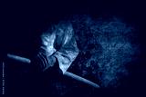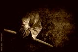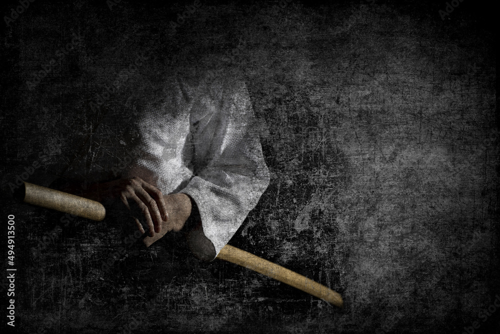 Person in black hakama standing in fighting pose with wooden sword bokken over dark grunge background.