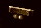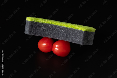 Black washing sponge on two red tomatoes on black background. Concept of thorough washing of vegetables and fruits, excessive cleanliness, phobia