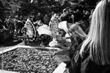 Girl holds Ukrainian mourning flowers. Funeral of the Ukrainian military. Civil and military at the funeral ceremony of the deceased soldier. Farewell to the dead soldiers. War in Ukraine