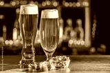Glass of beer on bar counter. Jugs, mugs, pints of brew beverage, ale, cider on wooden table in pub, bar. Backlit dark showcase with craft beer bottles in brewery. French fries fried potatoes snack