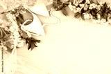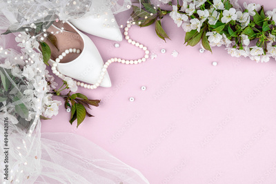 White shoes of the bride, and cherry blossom in spring. Festive wedding background. White beads, veil, wedding dress hem