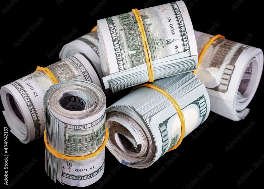 Gangster roll, bankroll, money roll, bundle of dollar money cash. Currency banknotes
