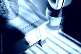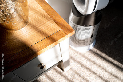 Shallow focus of a solid wood table seen near an air purifier within a show home living room. An ornate crystal table lamp can be seen.