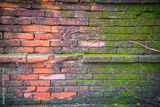 Old red brick wall covered with green, moss, fern texture background. Detail of nature, environmental and texture background concept.