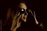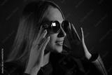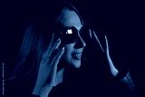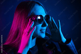 Cute girl with long hair near glowing pink neon city at night. Dyed blue pink hair of a young woman. Mysterious hipster teenager in round glasses.