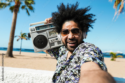 African American man listening music with vintage boombox stereo outdoor with beach in background - Focus on face
