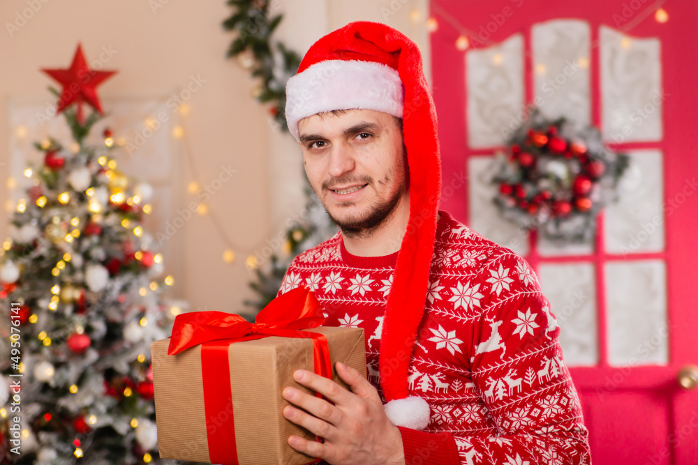 A young man in a long red santa hat in a sweater with a Scandinavian pattern against the backdrop of a Christmas tree porch. New Year