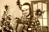 A young man in a long red santa hat in a sweater with a Scandinavian pattern against the backdrop of a Christmas tree porch. New Year