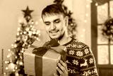 A young man in a sweater with a Scandinavian pattern in front of a Christmas tree porch. New Year