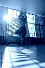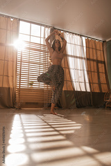 Young woman doing yoga exercises early in the morning. Meditates after sleep in a bright sunny room. Healthy lifestyle .