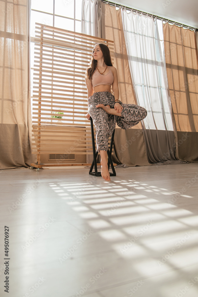 Young woman doing yoga exercises early in the morning. Meditates after sleep in a bright sunny room. Healthy lifestyle .