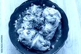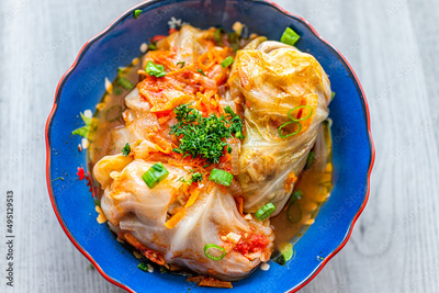 Closeup above view of Russian or Ukrainian dish called golubci golubtsi made with ground beef meat stuffed cabbage with carrots in serving bowl