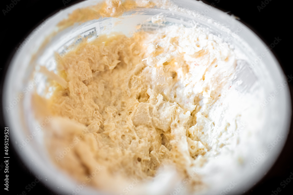 Closeup macro blue crab or whitefish spread storebought dip with texture detail and black background