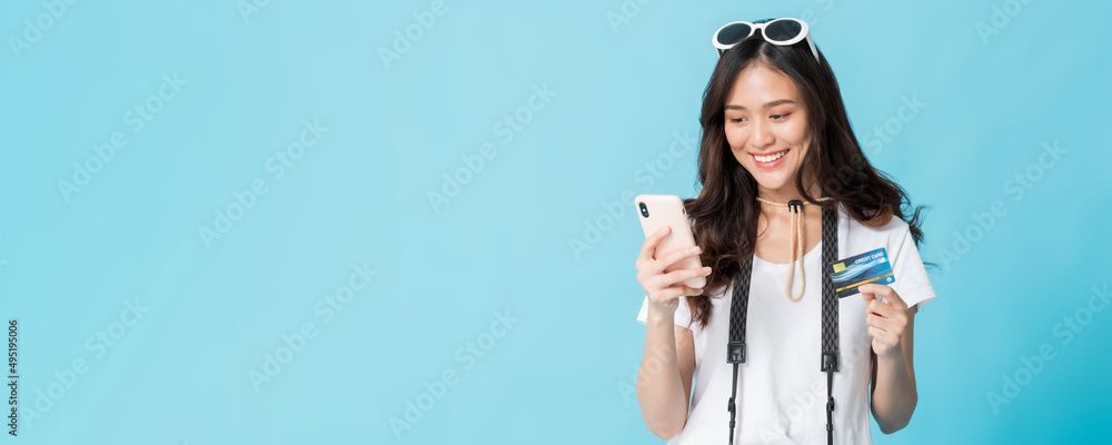 Asian pretty woman tourist preparing for travel and shopping online with smartphone and credit card isolated on blue banner background.Concept of people using technology of travel.
