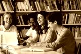 Laughing multi ethnic students use laptop studying or having fun using laptop sit at shared table in university library, having friendly relations, prepare for exams together using modern tech concept